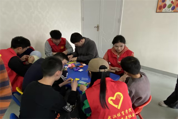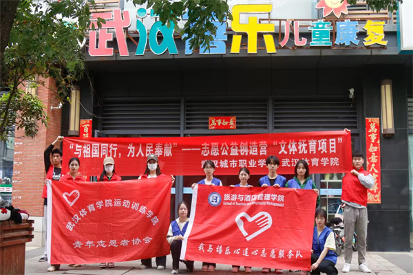 2023年4月28日,武汉城市职业学院旅游与酒店管理学院和武汉体育学院运动训练学院共派出12名志愿者前往武汉市禧乐儿童康复中心陪伴孩子们进行康复训练。