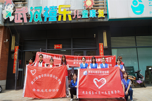 2023年5月5日,武汉城市职业学院旅游与酒店管理学院和武汉体育学院运动训练学院一起派出了12名志愿者前往武汉市禧乐儿童康复中心陪伴孩子们进行康复训练。