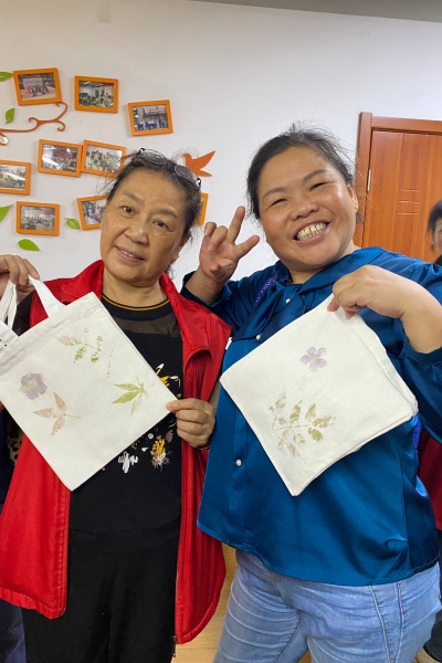 现场气氛活跃,老人们互相交流制作心得。72岁的张阿姨在实践队员的指导下,一边调整敲拓力度,一边热情地与邻居分享她掌握到的经验。随着“咚咚咚”的敲击声接连响起,植物汁液慢慢浸润素白布料,数十分钟后,一片片银杏、枫叶、月季花瓣纷纷在帆布包上“绽放”,每一件独一无二的作品,既是老人巧思的结晶,更是满含他们对自然的热爱。