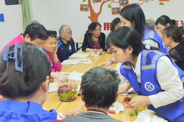 2025年9月25日下午,武汉城市职业学院旅游与酒店管理学院入党积极分子社会实践队走进洪山区珞狮路社区党员群众服务中心为老人们开展植物拓染活动。