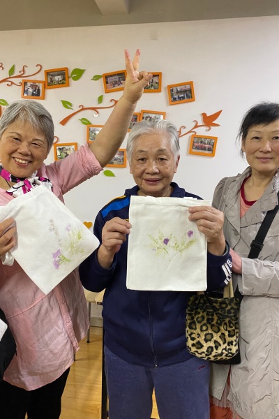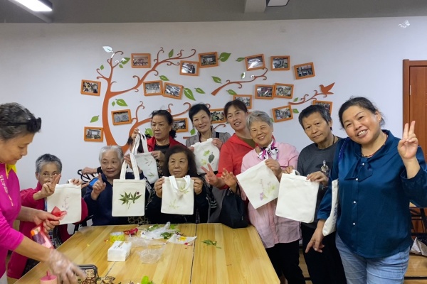在动手体验环节,老人们迫不及待地投入拓染创作,现场瞬间变身“非遗工坊”。大家围坐在桌前,专注神情尽显热情:有人俯身挑选花叶,反复调整搭配出雅致构图;有人直接用胶带将绿植固定在帆布包上,以质朴方式留住秋日;还有人特意选红褐秋叶,精心堆叠出层次美感。