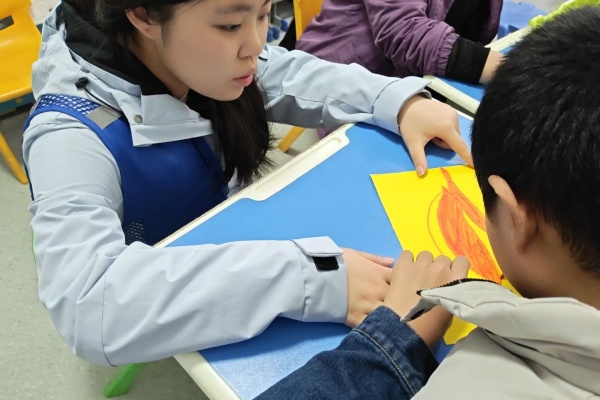 活动现场,志愿者们提前准备了彩笔、彩纸和扭扭棒等手工材料。教室里氛围安静而温馨,互动有序开展。有的志愿者用画笔在纸上创作,同时为身旁安静的孩子讲述画面中的故事,引导孩子发挥想象;有的志愿者陪伴在孩子身边,辅导他们完成作业,遇到孩子不理解的地方,便放慢语速、耐心讲解,孩子每答对一题,志愿者都会给予肯定和鼓励;还有的志愿者和孩子一起用扭扭棒制作小动物,他们先示范基本步骤,再手把手教孩子操作,过程中不时交流互动。其中一位志愿者一直牵着一位不会说话的小女孩,带着她认识各种玩具,教她简单的玩法。