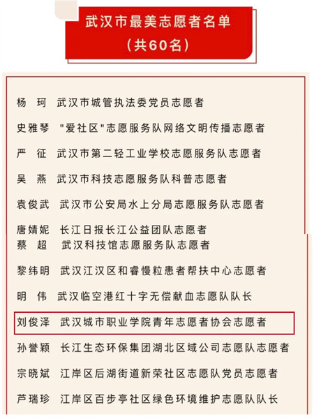 日前,在武汉市2021年度学雷锋志愿服务“四个一批”先进典型评选中,我校旅游与酒店管理学院刘俊泽同学获评为“武汉市最美志愿者”。