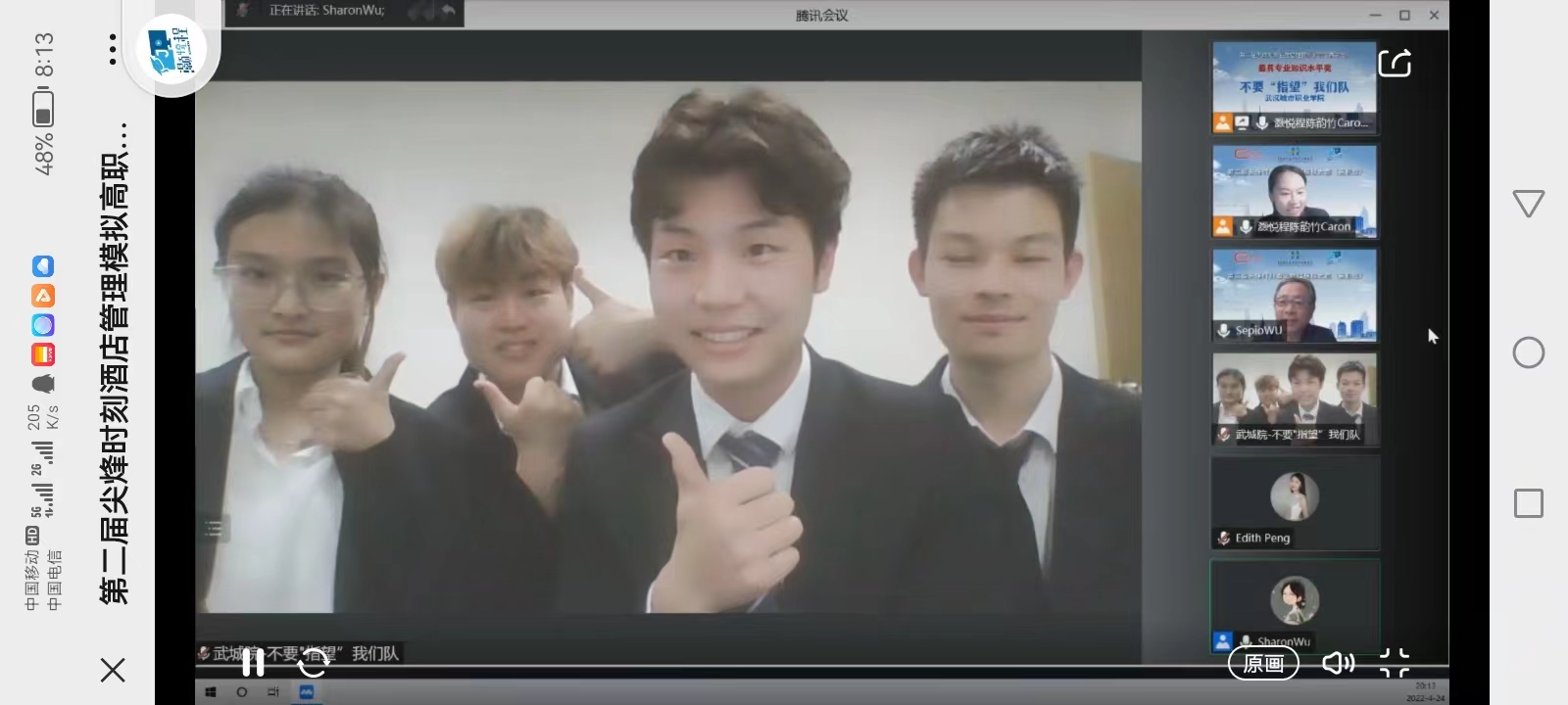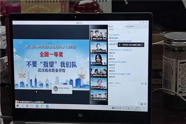 从4月1日至4月24日决赛期间,来自旅游与酒店管理学院酒店2001班张子健、付文凯,酒店2103班周思颖、周沛恒,团队内部分工协作,酒店教研室钟华老师及各专任教师悉心指导,经过了商业海报路演、商业路演视频、六个回合模拟竞技和现场商业演示答辩四大环节的比拼,最终获得全国一等奖第一名、在现场商业演示答辩环节,面对评委们的专业提问,队长张子健沉着冷静,从容应答,展现了良好的酒店人的专业和风度,最终团队荣获了最具专业知识水平奖。