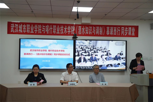 4月27日上午,武汉城市职业学院与喀什职业技术学院《酒水知识与调制》慕课西行同步课堂启动仪式在云端顺利举行。我校教务处处长向健极、旅游与酒店管理学院院长沈斌、喀什职业技术学院教务处处长李新、经济管理系主任乔骏、智慧树网总部副总裁王健、湖北分公司总经理李海峰、新疆分公司总经理郭俊杰参加了启动仪式,另外,出席本次启动仪式的还有两校教务处、旅游与酒店管理学院、经济管理学院相关领导和老师、智慧树湖北分公司、新疆分公司相关部门领导、技术人员及同步课堂全体学生。启动仪式由武汉城市职业学院旅游与酒店管理学院副院长陈戎主持。
