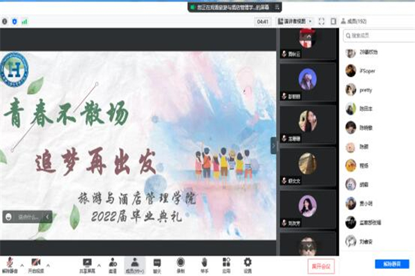 2022年6月14日星期二晚19:00,武汉城市职业学院旅游与酒店管理学院2022届毕业生在线上举行了“青春不散场,追梦再出发”毕业典礼,观会人员有武汉城市职业学院旅游与酒店管理学院2022届全体毕业生。