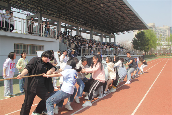 比赛还未开始时,双方队员即进入“战斗”状态,双手紧握麻绳,双脚用力着地,身体微向后倾,参赛队员齐心协力凝成了一股绳!各班的指挥者更是精神振奋,跑前跑后地布置战略,俨然是一位坐镇疆场的将军。拔河比赛过程中,各个班级的队员以胜不骄、败不馁的精神,个个精神饱满、斗志昂扬。现场气氛异常高涨,参赛队员鼓足了劲,涨红了脸,抓紧了绳。特别是当双方胜负难分的时刻,尽管他们此时都已经身心疲惫,但是他们仍毫不退缩,而是咬紧牙关,坚持到底,其精神值得我们每一个同学学习。热情的啦啦队在场外高喊着加油!加油!”震耳欲聋的声音此起彼伏。每一个参赛队员全力以赴,每一颗心都为了长绳上那小小的红线而紧张!每场比赛牵动着老师们的心,呐喊声中,师生融为一体,师生的心贴得更紧了。经过激烈角逐,酒店管理专业2102班脱颖而出,摘得桂冠,酒店管理专业2202班和旅游管理2103班分获亚军和季军。