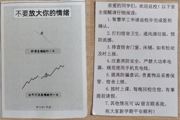 此次晚点名打破传统模式,周智能老师创新融入心理小插画、开学工作提示小标语等元素,既营造了轻松融洽的氛围,又直观传递了开学注意事项与心理调适技巧。点名过程中,周老师逐一核实学生到校情况,细致倾听学生假期生活点滴、返校后的适应状态,耐心解答同学们关于新学期学习、生活的疑问,及时掌握学生思想动态与实际需求。