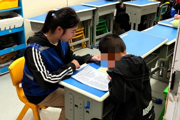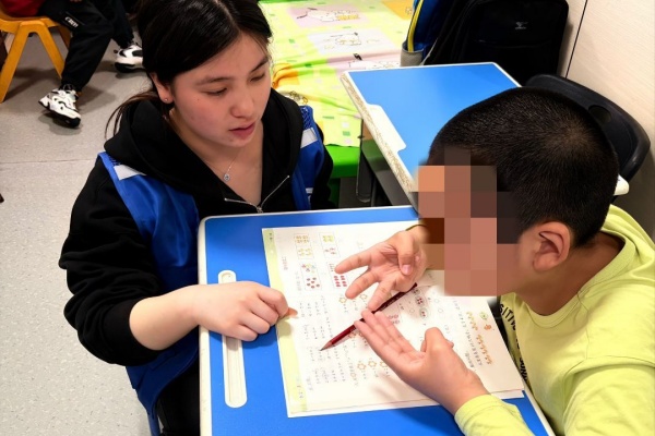 活动中,志愿者与8名“星星的孩子”一对一结对相伴。在作业辅导区,面对孩子们容易注意力分散、握笔困难等情况,志愿者始终耐心陪护。从手把手教学“天、人”的笔画,到伸出手指演示“5+3”的加法运算,他们以温柔的引导,陪伴孩子们克服一个个学习中的小挑战。